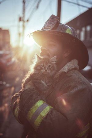 Firefighter holding a rescued kitten at sunset after putting out a fire