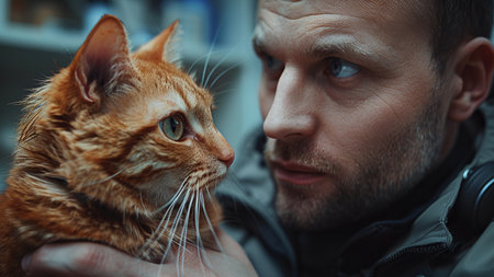 Man bonding with closed eyes to his surprised striped cat sitting at his knees