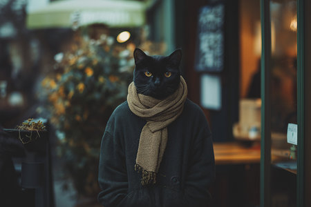 A tall anthropomorphic cat dressed in a warm scarf stands outside a charming cafe. The evening atmosphere is inviting, with soft lights illuminating the surroundings.