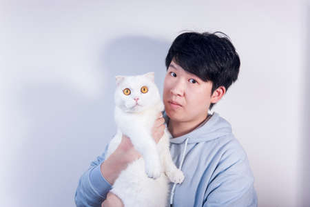 An Asian man holding a white British shorthair cat