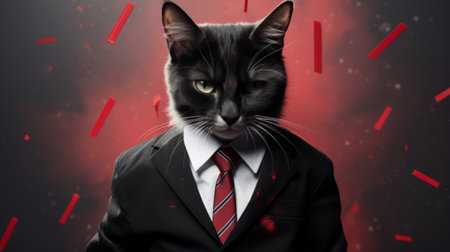 a cat wearing a business suit, inspired by the corporate punk style of michael komarck. the photo features a light black and red color scheme, with humorous imagery. it is a uniformly staged image, showcasing photoillustration techniques. this photo is associated with the associated press. ai generated