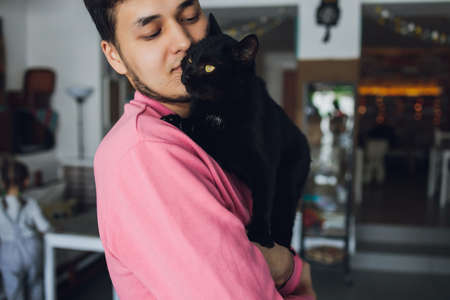 Handsome young man is holding a black cat in his arms.