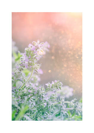Blooming thyme on sunset. Summer natural banner background. Interior photo poster in frame. Spicy aromatic herb for cooking and folk medicine