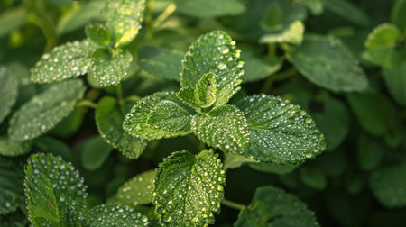 Close-up view of fresh mint leaves covered in dew drops. The leaves are a vibrant green and have a slightly glossy texture due to the water droplets. The image has a soft focus with a shallow depth of field, emphasizing the mint leaves in the foreground. The setting is outdoors in a natural environment. The image's visual style is perfect for use in food, beverage, or organic product marketing. It suggests health, freshness, and natural ingredients.