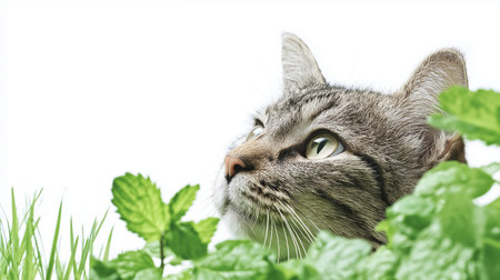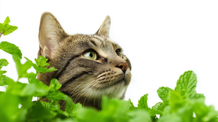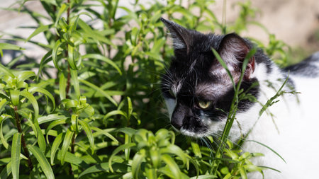 A charming cat curiously observes the world while hiding among lush green leaves in the garden.