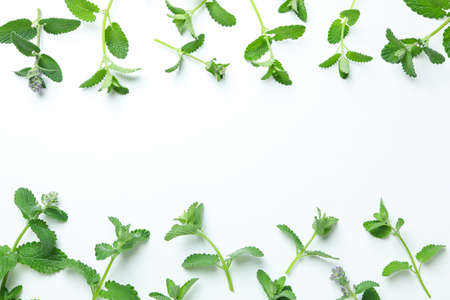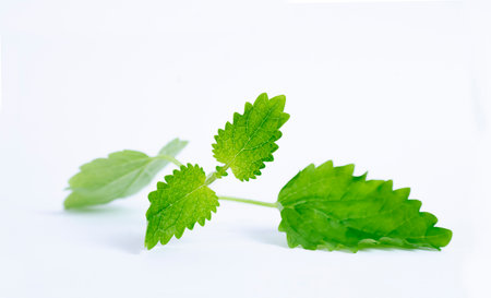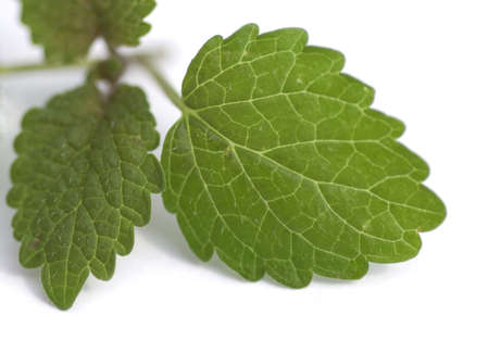Fresh melissa leaves on white background. Green melissa herb, closeup