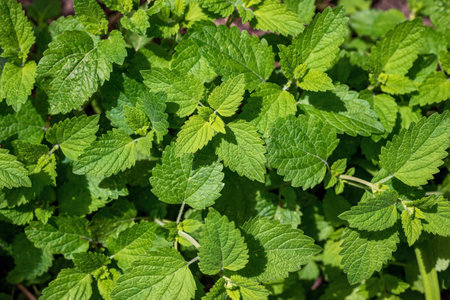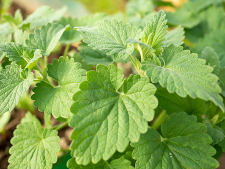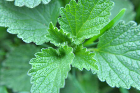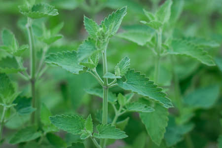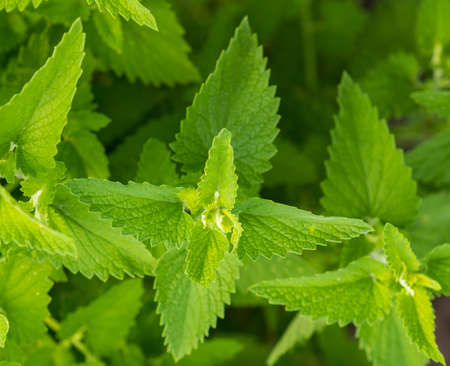 Green lemon balm leaves in the garden.