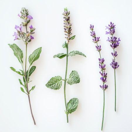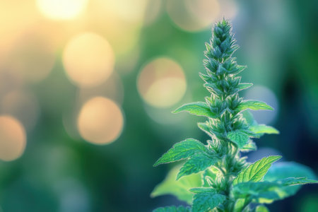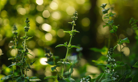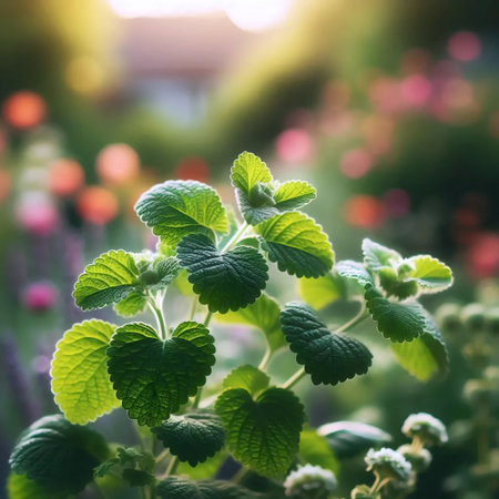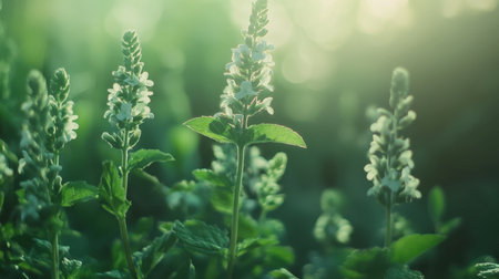 A serene closeup of green herbal plants with delicate blooming flowers, bathed in soft natural light, evoking feelings of tranquility and freshness. Perfect for nature-themed projects.