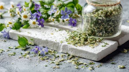 , high-angle view showcasing a clear glass jar containing dried, crushed green plant matter, positioned on stacked, rough white stone slabs. Fresh small white and purple wildflowers and green foliage spill across the scene, contrasting with the gray, textured surface underneath, suggesting natural remedies or herbalism.