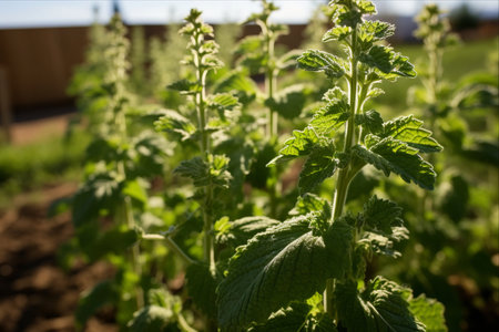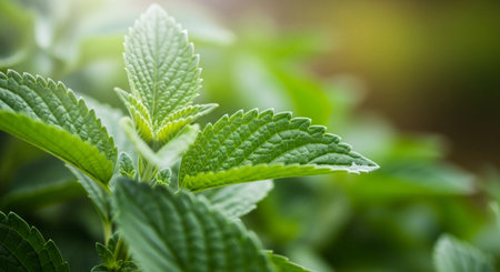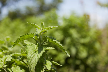 Lemon balm leaves close-up with lush green foliage in a garden setting