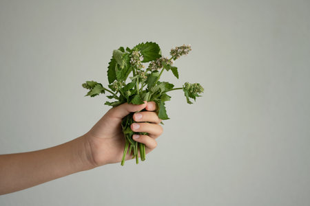 Bunch of fresh greenery in woman hand on gray background