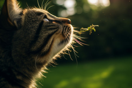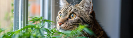 A captivating image captures a curious cat's fascination with a potted cannabis plant The high-resolution photo showcases intricate details of the feline's inquisitive gaze and the lush green foliage of the marijuana plant, creating a visually stunning and thought-provoking scene AI Generative