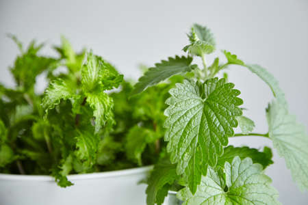 Fresh mint and melissa leaves in white bowl, closeup. green spearmint herb