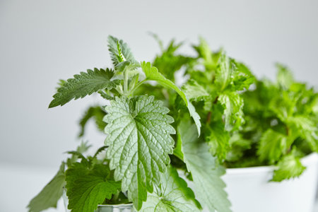 Medicinal plant fresh leaves of nettles, selective focus. Fresh nettle leaf on the kitchen table a rustic background.