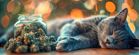 A purrfectly relaxed cat naps contentedly beside a jar of CBD treats, embodying the calming power of CBD for feline companions High-resolution photorealistic detail captures the cat's serene expression, suggesting the benefits of CBD for stress reduction and enhanced well-being Ideal for promoting CBD products for pets AI Generative