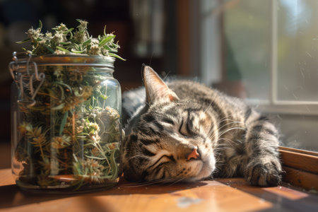 A captivating photorealistic image showcasing a contented cat napping peacefully beside a jar of CBD treats The image captures the serenity of feline relaxation, hinting at the calming effects of CBD while highlighting its potential to enhance pet wellness A high-resolution masterpiece perfect for showcasing the benefits of CBD for pets AI Generative