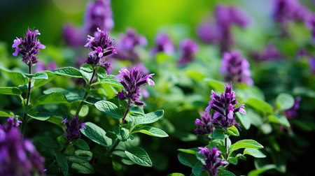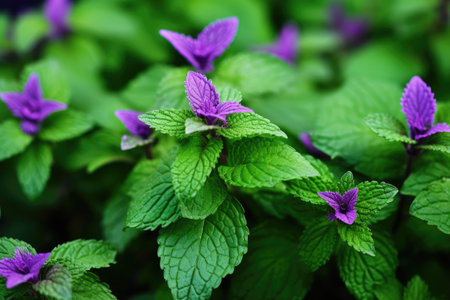 A serene close-up of a mint plant showcasing rich green leaves and delicate purple blossoms, set in a natural environment that highlights beauty and tranquility.