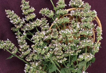Beam catmint (Nepeta cataria ) lies in the basket on the tablecloth.