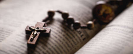 Christian cross necklace on Holy Bible book, Jesus religion concept as good friday or easter festival