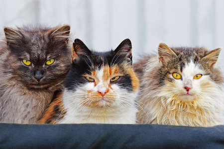 A group of beautiful cats . Portrait of colorful cats looking at the camera.