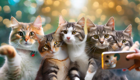 A gathering of cats attentively observing their surroundings, showcasing various fur patterns and colors. The warm lighting highlights their curious expressions and creates a cozy atmosphere.