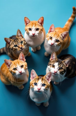Six cats of various breeds sitting in a circle against a vibrant blue background, gazing up with curious expressions, creating an irresistibly charming and heartwarming scene