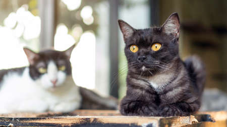 Temperamental british domestic cat looks at you closeup with blurred background.