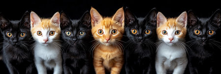 Portrait of Seven Adorable Kittens with Different Colors of Fur on a Black Background