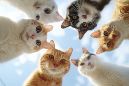 Five cats are gathered in a circle and looking up at the camera with bright expressions against a clear blue sky. Their light fur shines in the natural light.