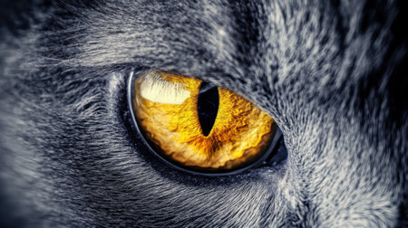 The striking orange iris of a cat's eye captures attention, surrounded by soft gray fur. The detailed texture highlights the beauty of this feline. A mesmerizing natural feature