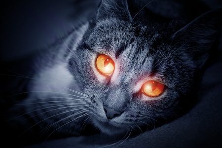 Close up photo of a mystical glowing cat with vibrant orange eyes and fur detail