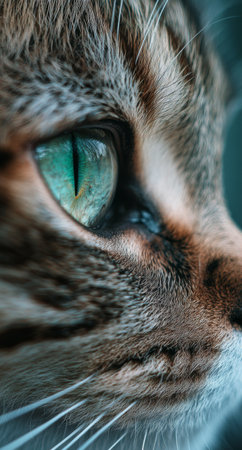 This striking close-up showcases a cat's eye in sharp focus, revealing intricate details and vibrant colors enhanced by a soft blur surrounding it.