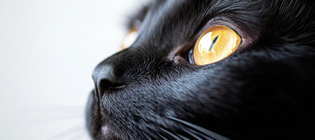 Intense gaze from a black Cornish Rex cat with captivating amber eyes against a soft white backdrop