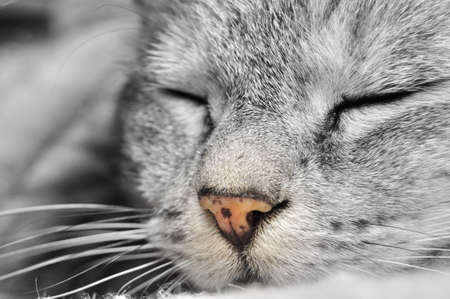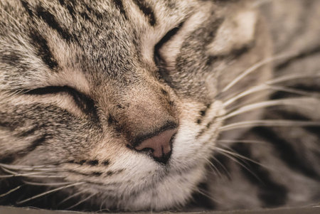 Macro zoom soft a bit blur on cat face at its nose and mouth while sleeping, for background of fur texture of cute animal - Vertical image