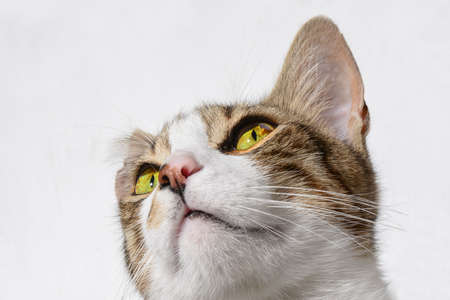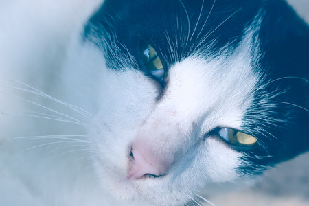 Photo of domestic cat (pet) in closed plan, with a fixed and cute look. Real animal in a real situation.