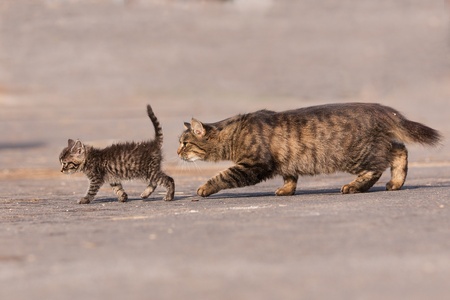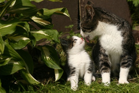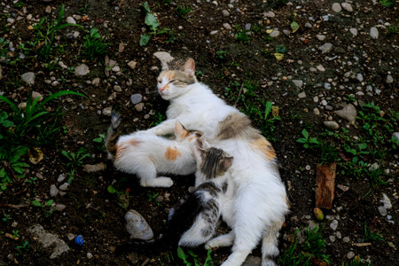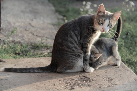 Mom cat with her children kittens. Kitten pet milk on the nature. Pet in the countryside. Stock background for design