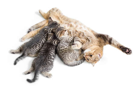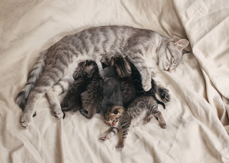 Mother cat breastfeeding her kittens. Close-up, selective focus.