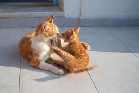 cute and lovely calico female cat kissing male american shorthair cat on the ground at the city road. love and romantic moments. pet and animal city lifestyle concept.