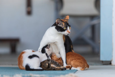 a mother cat nursing her kittens, showcasing maternal care, tenderness, and the strong bond between mother and offspring in the animal kingdom