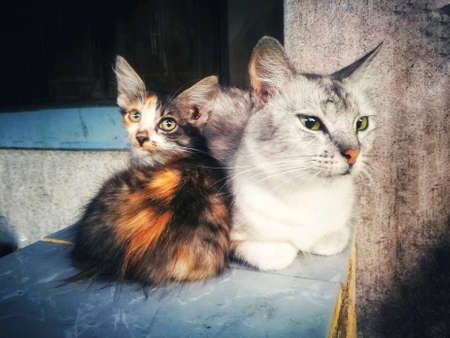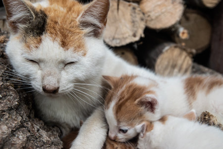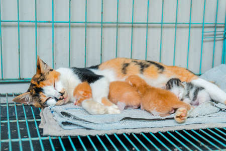 Abandoned Cat with kittens. kittens Under the maternity protection. Animal protection. Homeless animals.Low key.
