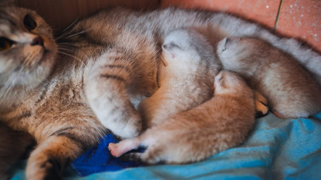 Scottish fold cat nursing her kittens lying on a blue blanket