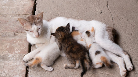 The mother cat is feeding all 4 kittens on the concrete floor. Breastfeeding from the mother's breast to four kittens.
