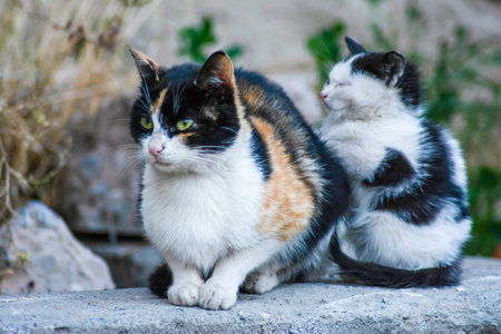 maneki neko tricolor cat and her small kittens, family portrait outdoor, relaxation domestic animals.