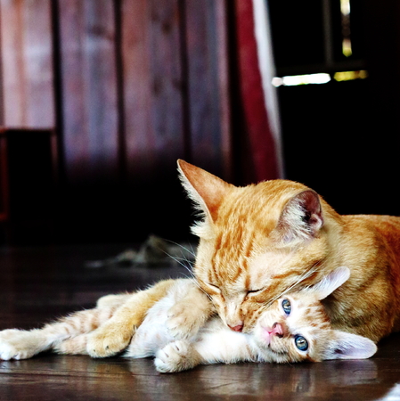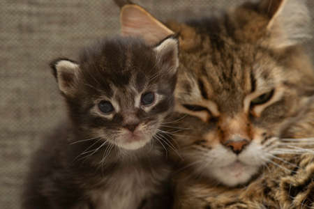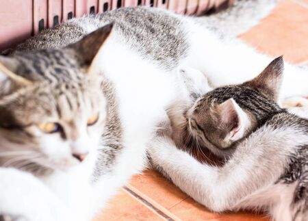 Cat nursing her kittens. Mom cat hugging her kitten with love