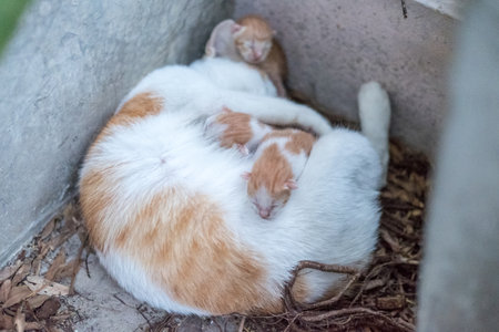 Orange and white mother cat nursing her newborn kittens in a village yard