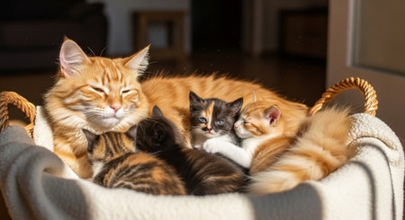 Adorable kittens sleeping with cat on soft bed, cute furry family. Mother cat resting with two little kittens on comfy blanket in room, sweet moment. Motherhood and adoption concept