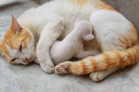 Newborn baby red cat drink their mothers milk. Cat feeding small cute ginger kitten. Domestic animal. Sleep and cozy nap time. Comfortable pets sleep at cozy home.