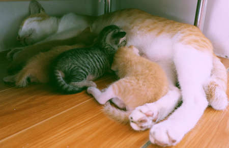 Group of new born kitten breastfeeding from mother cat on floor, baby cat with orange and grey feather