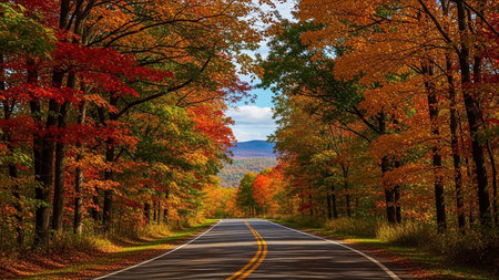 A dark asphalt road curves through a vibrant autumn forest. The trees lining the road are ablaze with the rich colors of fall foliage, displaying shades of red, orange, and yellow. Fallen leaves are scattered across the road and its shoulders, adding texture and a sense of the season. Double yellow lines mark the center of the road, guiding the eye into the distance where rolling hills or mountains are visible. The sunlight filters through the colorful canopy, creating a warm and inviting...