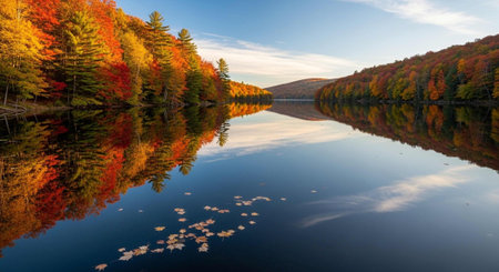 A stunning autumn landscape capturing still water reflections and vibrant foliage, creating a serene and tranquil atmosphere in nature's embrace.